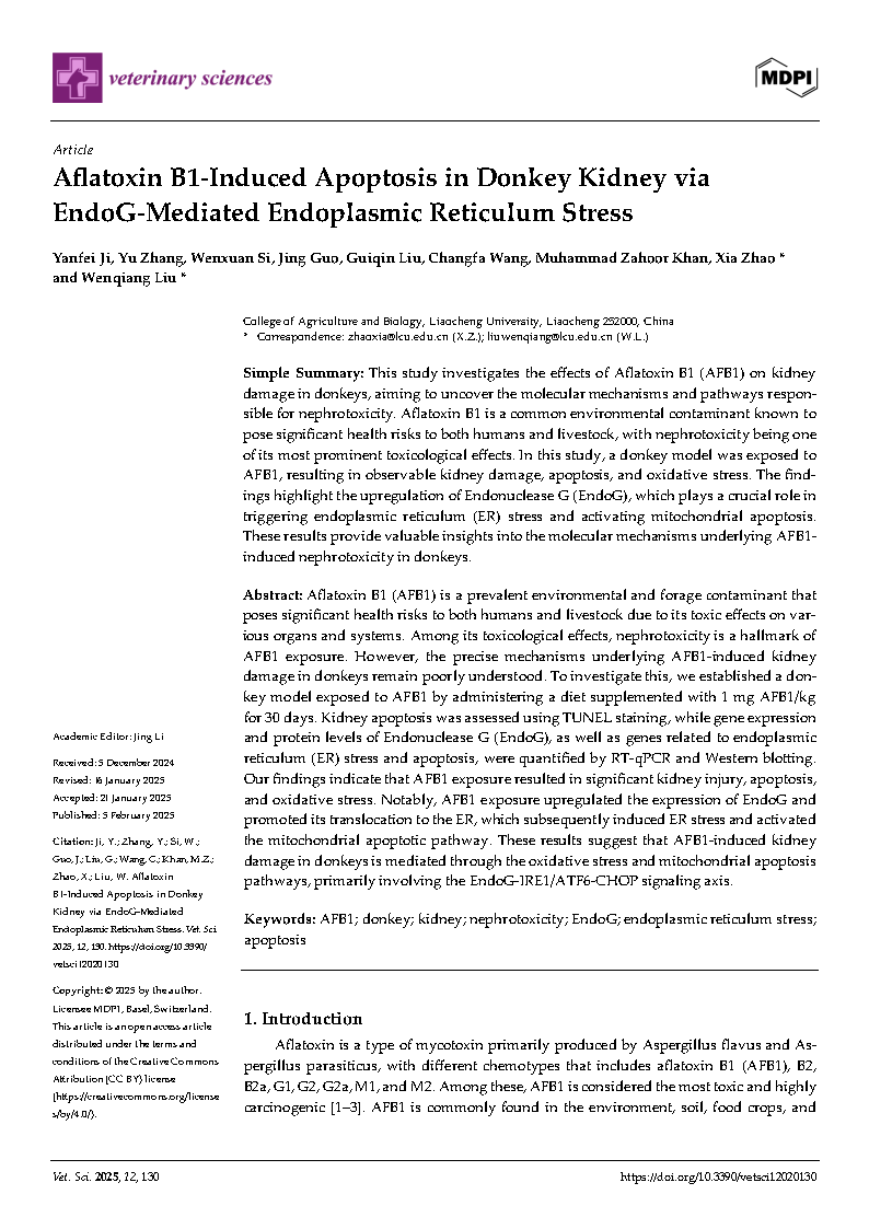 世界杯2022级动物学专业研究生纪言霏在《Veternary Science》杂志上发表了题为“Aflatoxin B1-Induced Apoptosis in Donkey Kidney via EndoG-Mediated Endoplasmic Reticulum Stress”的研究论文,指导教师为刘文强教授、赵霞博士。