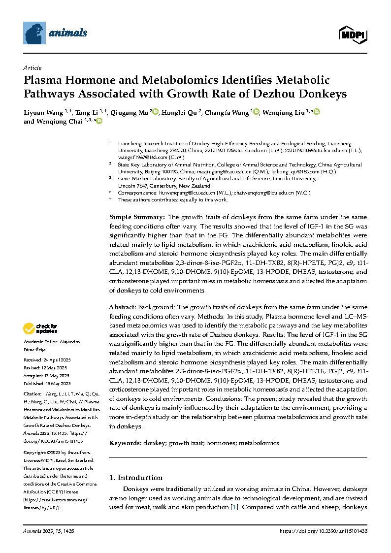 世界杯2022级动物学专业研究生王莉源在《Animals》杂志上发表了题为“Plasma Hormone and Metabolomics Identifies Metabolic Pathways Associated with Growth Rate of Dezhou Donkeys”的研究论文,指导教师为刘文强教授、柴文琼副教授。
