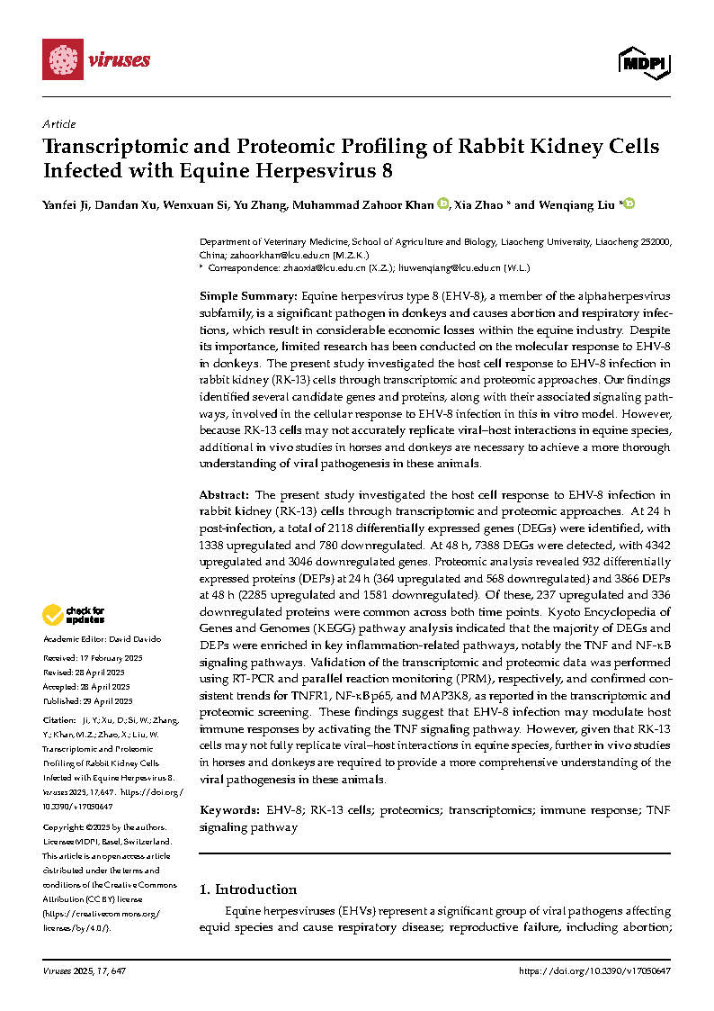 世界杯2022级动物学专业研究生纪言霏在《Viruses-Basel》杂志上发表了题为“Transcriptomic and Proteomic Profiling of Rabbit Kidney Cells Infected with Equine Herpesvirus 8”的研究论文,指导教师刘文强教授、赵霞博士。