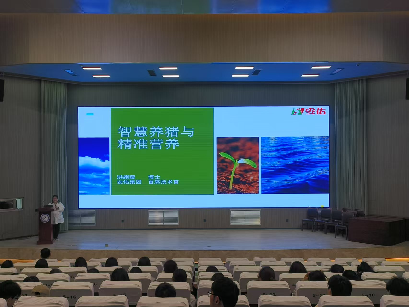 讲座还特别设置企业招聘环节,安佑集团作为国内畜牧行业龙头企业,现场进行人才招募:面向本科毕业生开放养殖技术、饲料研发、智能装备等核心岗位。据洪翊棻介绍,安佑集团始终坚持"科技兴农、产业报国"理念,持续加大智能养殖领域投入,助力产业升级,并且期待与聊大师生携手,将前沿技术转化为产业动能,共同书写智慧畜牧的新篇章。