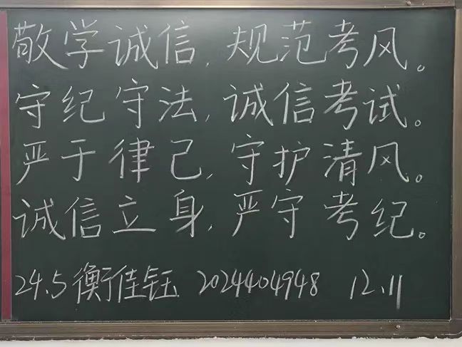 为加强学风建设,严肃考风考纪,引导学生树立正确的价值观和考试观,提升学生的诚信意识和自律能力,为即将到来的各类考试营造一个公平、公正、诚信的良好氛围。美加墨世界杯官方网站于12月11日举办“明考纪,肃考风”黑板字书写活动活动。