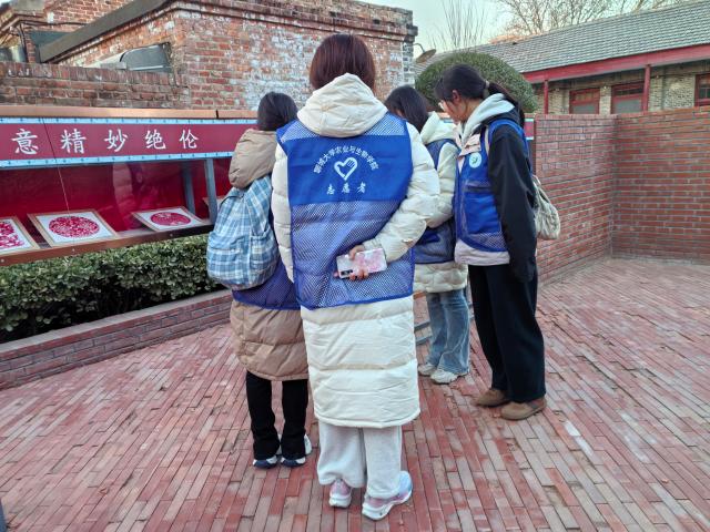 踏入古城,志愿者们被无处不在的剪纸作品所吸引。在参观过程中,几位老人正对着一幅大型剪纸作品交流探讨,志愿者们虚心向老人们请教聊城剪纸的历史渊源。老人们为志愿者们详细讲解着作品背后的寓意和相关民俗传统。从春节时装点门窗的多彩窗花,到婚俗中寓意“龙凤呈祥”的精美剪纸,再到寿诞上象征“松鹤延年”的祝福之作,老人们的讲述让志愿者们深刻感受到剪纸艺术之美。为更全面了解聊城剪纸的现状,志愿者们还与当地非遗文化工作人员进行了深入交流,工作人员耐心解答,指出当下剪纸传承受人才断层、市场小众等问题制约,并分享已开展的创新举措,包括与当地学校合办兴趣班、举办剪纸艺术展览等。