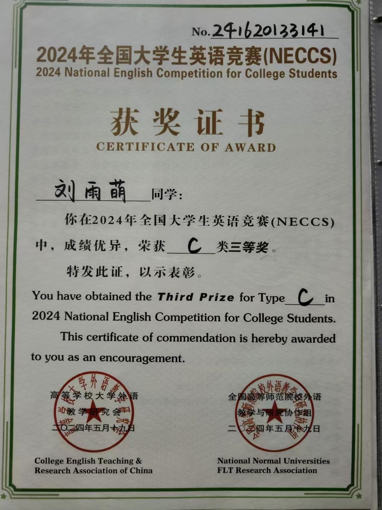 世界杯刘雨萌同学在2024年全国大学生英语竞赛(NECCS)中,成绩优异,荣获C类三等奖,对该获奖同学予以祝贺表彰。