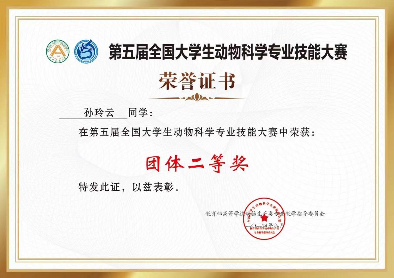 世界杯孙玲云同学在第五届全国大学生动物科学专业技能大赛中荣获二等奖,对该获奖同学予以祝贺表彰。