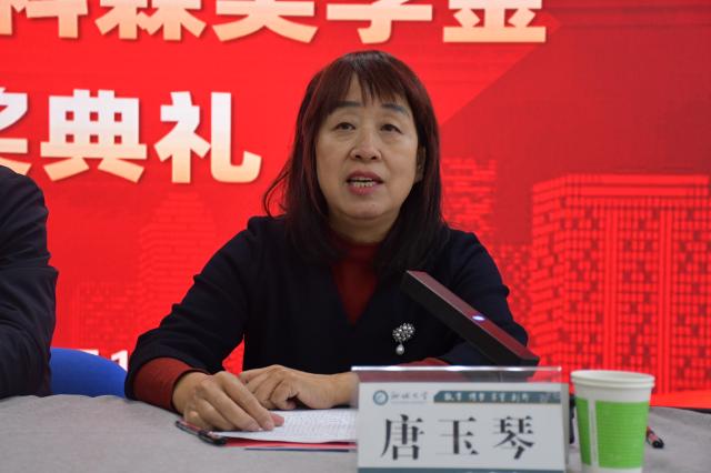 唐玉琴代表学校党委学生工作处向校友捐资兴学的善行义举表示感谢,并向获奖学生表示祝贺。她鼓励获奖学生要志存高远、理想坚定,珍惜荣誉、砥砺奋进,尽责担当、回馈社会,把自己锻炼成为栋梁之材,为将来更好地服务社会、报效祖国打下坚实的基础。