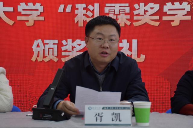 12月12日,美加墨世界杯官方网站“科霖”奖学金颁奖仪式在美加墨世界杯官方网站举行。山东省科霖检测有限公司总经理胥凯(1998级校友)、质控科科长贾国霞等企业代表,美加墨世界杯官方网站党委学生工作处副处长唐玉琴,美加墨世界杯官方网站院长贾泽峰,党委副书记、副院长吴洪宇以及部分教师、学生代表共同参加仪式。