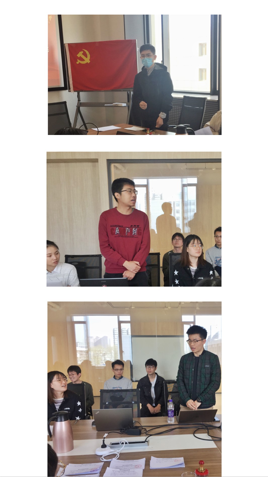 会议第二项,曹银浩、韩祎然、刘翔宇、魏晨光、吴礼金、张伟豪、王庆麟7名同志先后向支部全体党员汇报对党的认识、入党动机、个人履历、家庭和主要社会关系情况,以及需要向党组织说明的问题。