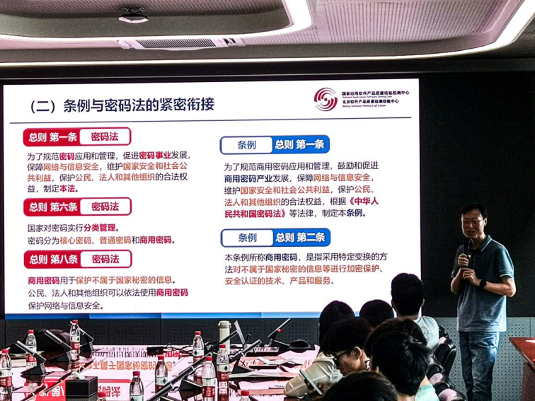 在党建共建会上,北航网安学院党建辅导员张晗同志与北软检测中心党支部副书记郭剑虹同志分别介绍了各自支部建设情况及本次共建活动的意义。随后,北软检测中心信息安全测评实验室副主任王坤同志分享了密码法和商密条例相关内容,讲述了我国网络安全的技术发展和密码法的立法过程。