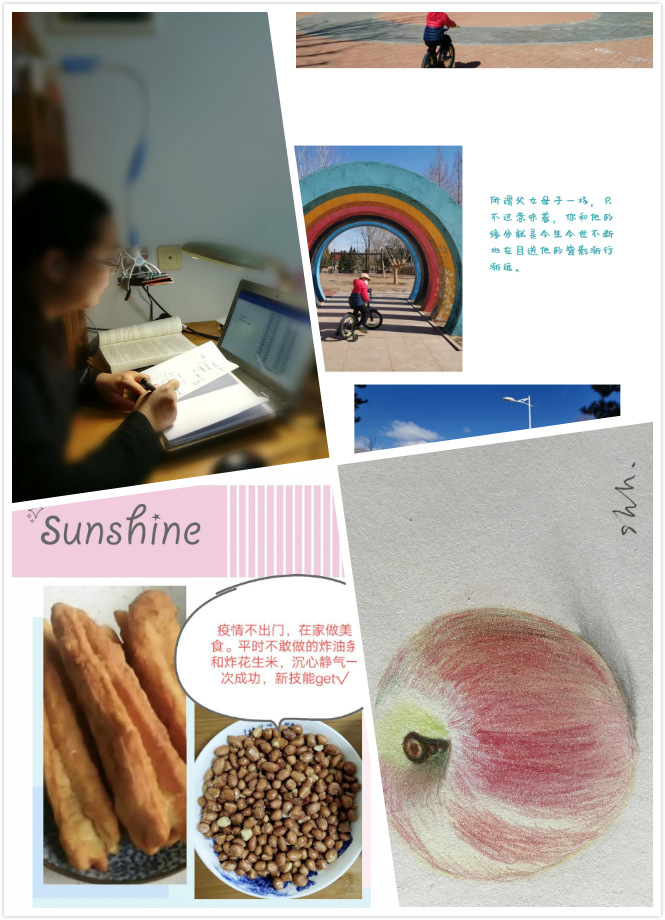 学院女教师们在微信群中积极分享作品,有停课不停教,宅家录不停的工作照;有强健体魄,为祖国健康工作五十年的健身照;也有利用难得的居家时光陪伴子女,开展画画、乐高等怡情、趣味活动;还有东坡肘子、蛋糕、油条、煎饼、意面等等的花样厨艺展示。大家也就作品展开了热烈的讨论交流,虽然各自宅在家中,却在线上共同度过了一个有意义的“三八”妇女节。