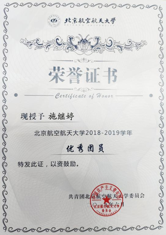 为加强我校共青团的基层组织建设,推动团支部职能化建设,围绕立德树人根本任务,激励基层团支部学习贯彻习近平新时代中国特色社会主义思想,以“四进”为手段,以“四信”为目标,切实学习和践行社会主义核心价值观,弘扬北航“四爱精神”,深入开展“青春心向党·建功新时代”教育实践,创先争优,激励和引导广大团员大力弘扬爱国主义精神,推动各级团组织工作水平的提高。校团委在全校开展2018—2019学年度校 “优秀团员”评选活动,beat365官网优秀学生张英鹏、施继婷获2018—2019学年度校“优秀团员”,予以表彰。