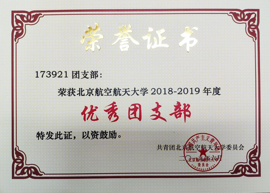 为加强我校共青团的基层组织建设,推动团支部职能化建设,围绕立德树人根本任务,激励基层团支部学习贯彻习近平新时代中国特色社会主义思想,以“四进”为手段,以“四信”为目标,切实学习和践行社会主义核心价值观,弘扬北航“四爱精神”,深入开展“青春心向党·建功新时代”教育实践,创先争优,激励和引导广大团员大力弘扬爱国主义精神,推动各级团组织工作水平的提高。校团委在全校开展2018—2019学年度校 “优秀团支部”评选活动,beat365唯一官网173921团支部获2018—2019学年度校“优秀团支部”荣誉称号,予以表彰。
