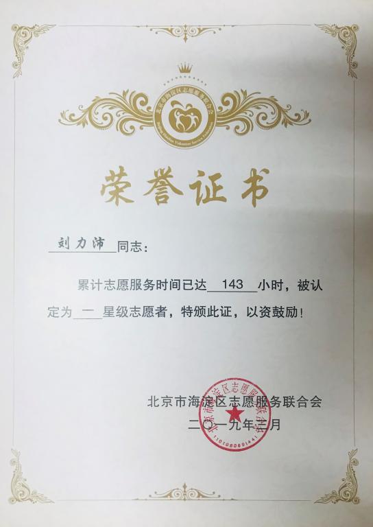 按照 北京市海淀区志愿服务联合会《关于认定星级志愿者以及评选表彰2018年度海淀区明星志愿者、优秀志愿服务团队、优秀志愿服务项目的通知》的相关评比办法,经过单位推荐、材料核实、评委老师评审等程序,beat365官网优秀学生刘力沛获“2018年度海淀区一星级志愿者”荣誉称号,予以表彰。