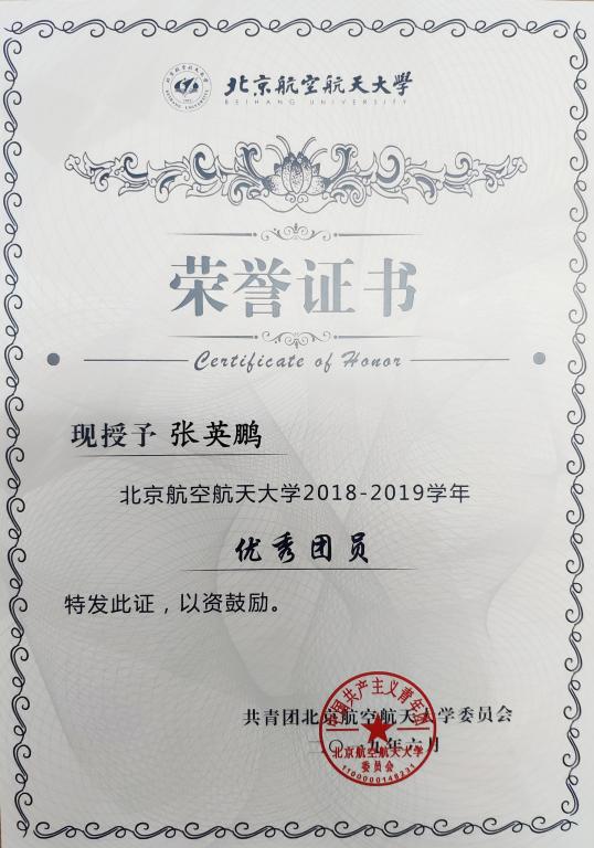 为加强我校共青团的基层组织建设,推动团支部职能化建设,围绕立德树人根本任务,激励基层团支部学习贯彻习近平新时代中国特色社会主义思想,以“四进”为手段,以“四信”为目标,切实学习和践行社会主义核心价值观,弘扬北航“四爱精神”,深入开展“青春心向党·建功新时代”教育实践,创先争优,激励和引导广大团员大力弘扬爱国主义精神,推动各级团组织工作水平的提高。校团委在全校开展2018—2019学年度校 “优秀团员”评选活动,beat365官网优秀学生张英鹏、施继婷获2018—2019学年度校“优秀团员”,予以表彰。