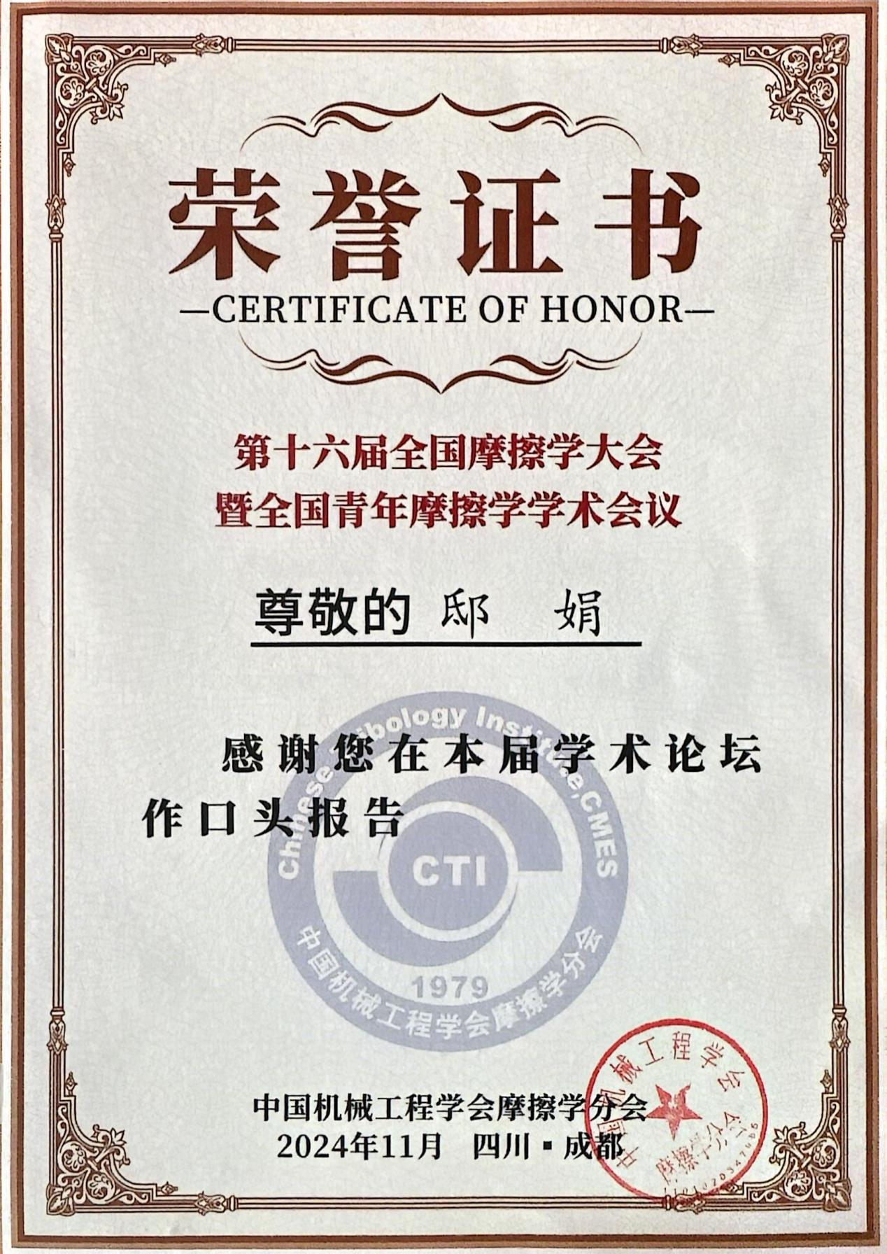 新葡萄官网智能运载装备研究所副所长邸娟副教授、李直副教授参加了本次学术会议。其中邸娟副教授在“专题2:表面工程及摩擦学”作了题为《百微米阵列凹槽结构下17-4PH叶片材料抗汽蚀机理及剩余寿命评估研究》的学术报告(获“优秀口头报告”荣誉),分享了能源及载运动力装备关键部件通流中的侵蚀劣化机理、防护策略及寿命预测研究的最新进展,与到会专家学者们以及各高校参会的研究生们进行了深入的学术探讨和交流。